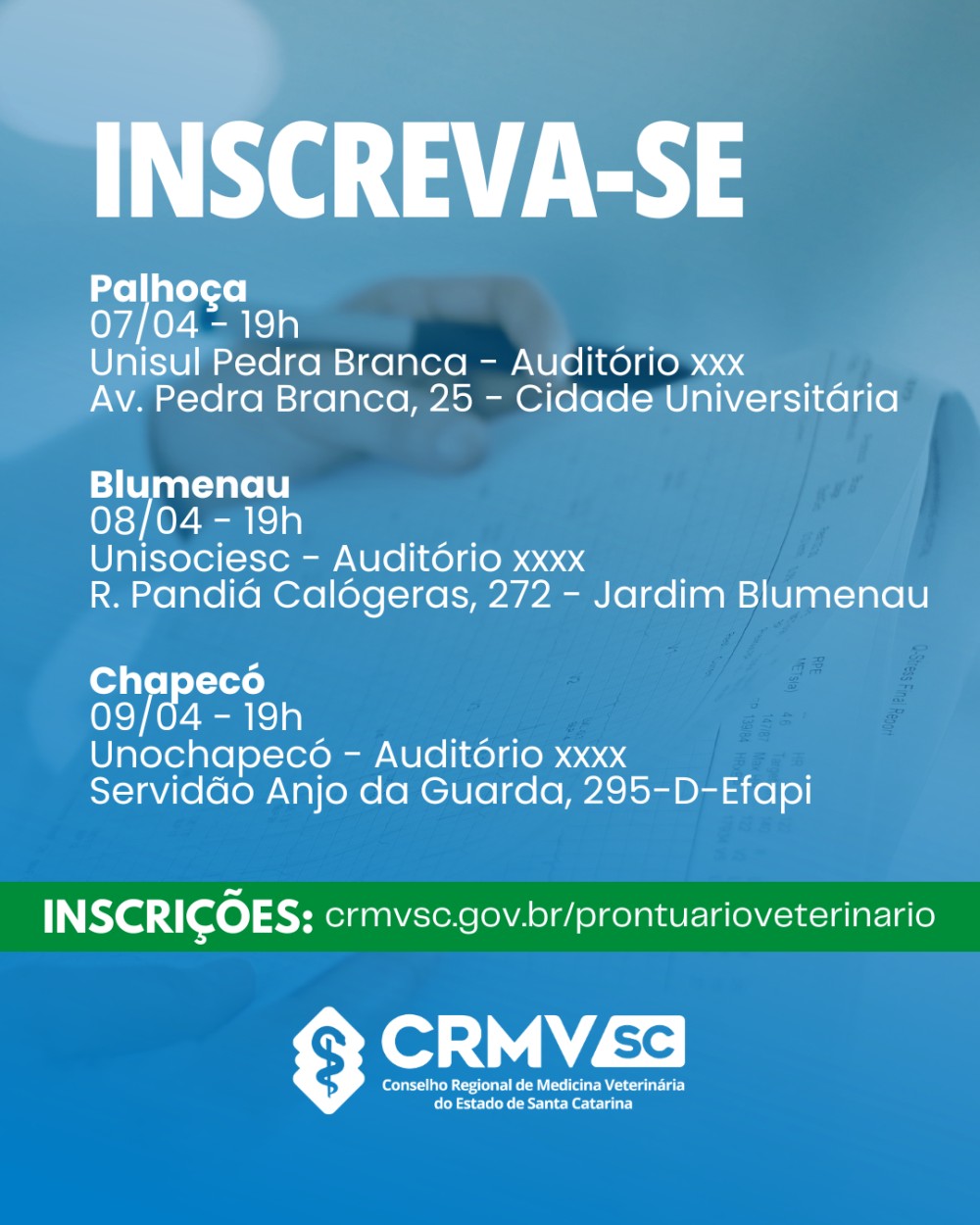 Com esse objetivo, o Conselho Regional de Medicina Veterinária de Santa Catarina (CRMV-SC) promoverá, no mês de abril, o evento “O Prontuário Médico-Veterinário como Ferramenta na Proteção do Exercício Profissional”, que acontecerá nas cidades de Palhoça, Blumenau, Chapecó, Criciúma e Joinville. A iniciativa visa qualificar ainda mais os médicos-veterinários para o correto registro clínico, elaboração de documentos técnicos e produção de informações que possam servir como prova em situações éticas, legais ou administrativas, especialmente em casos envolvendo suspeita de maus-tratos.