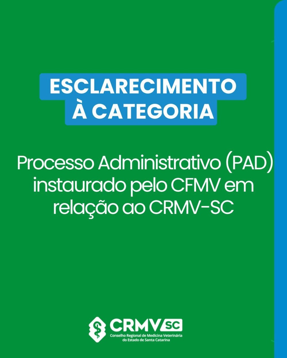 O Conselho Regional de Medicina Veterinária de Santa Catarina (CRMV-SC) informa à categoria que a atual gestão passou a responder, em setembro de 2025, a um Processo Administrativo Disciplinar (PAD) instaurado pelo Conselho Federal de Medicina Veterinária (CFMV).