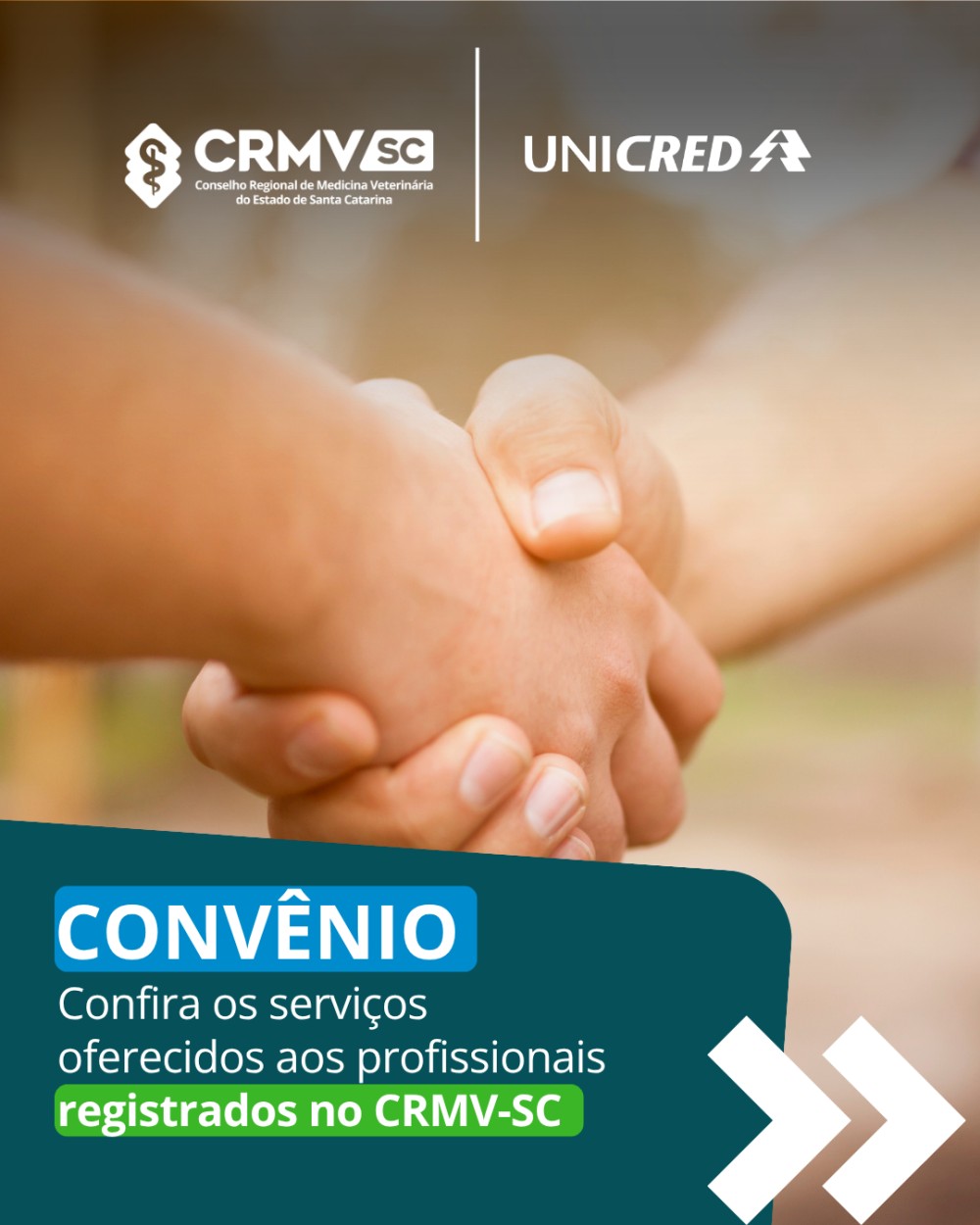 O CRMV-SC possui convênio com a Unicred - instituição financeira cooperativista, regulada pelos órgãos do sistema financeiro brasileiro. Possui um modelo de negócio diferenciado e há mais de 30 anos e mais de 50 mil associados da área da saúde.