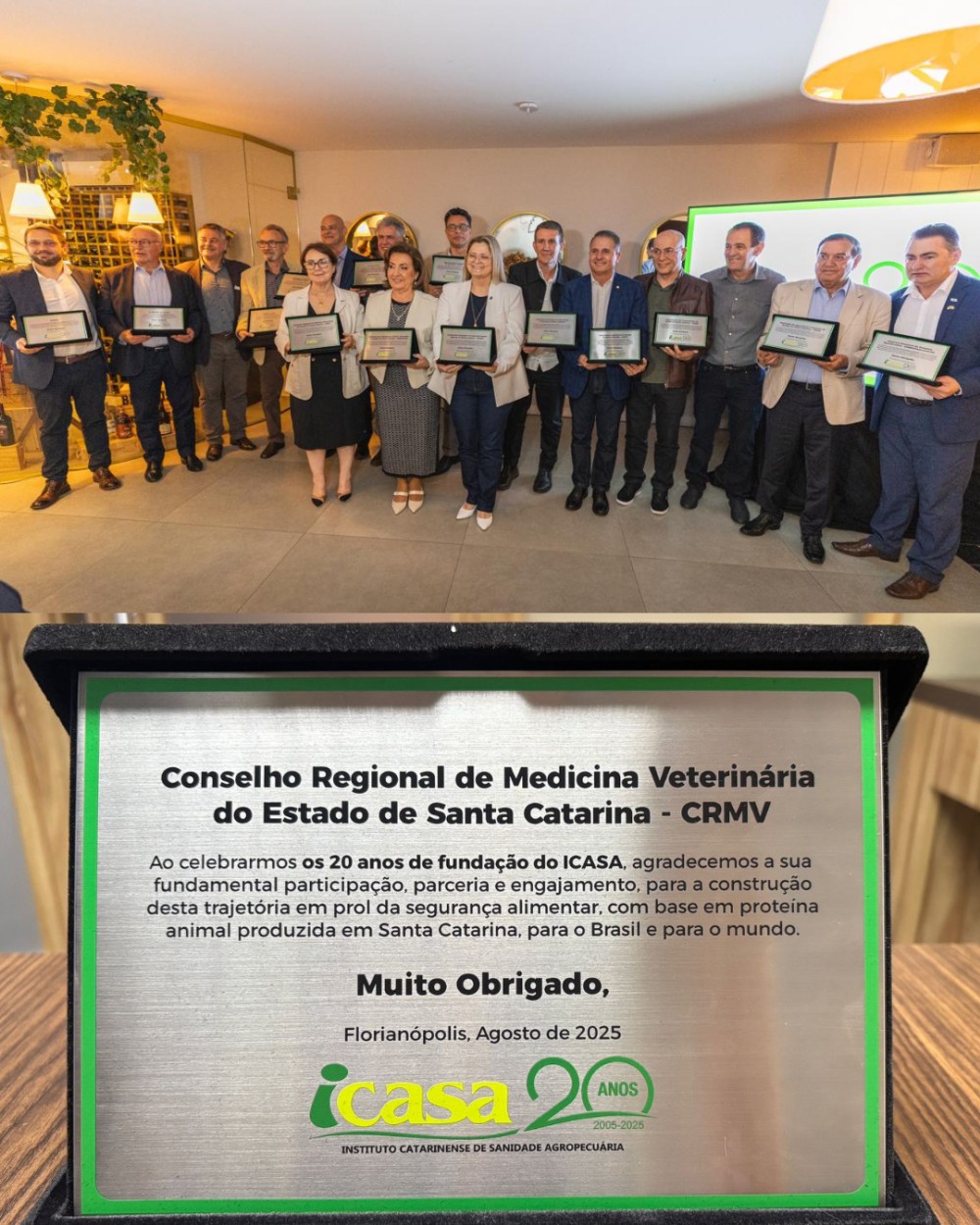 O Conselho Regional de Medicina Veterinária de Santa Catarina (CRMV-SC) foi homenageado durante a cerimônia que celebrou os 20 anos do Instituto Catarinense de Sanidade Agropecuária (Icasa). O evento foi realizado na última quinta-feira (21), em Florianópolis, e reuniu fundadores, produtores e empresas parceiras. VÍDEO