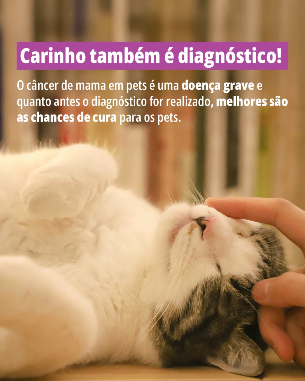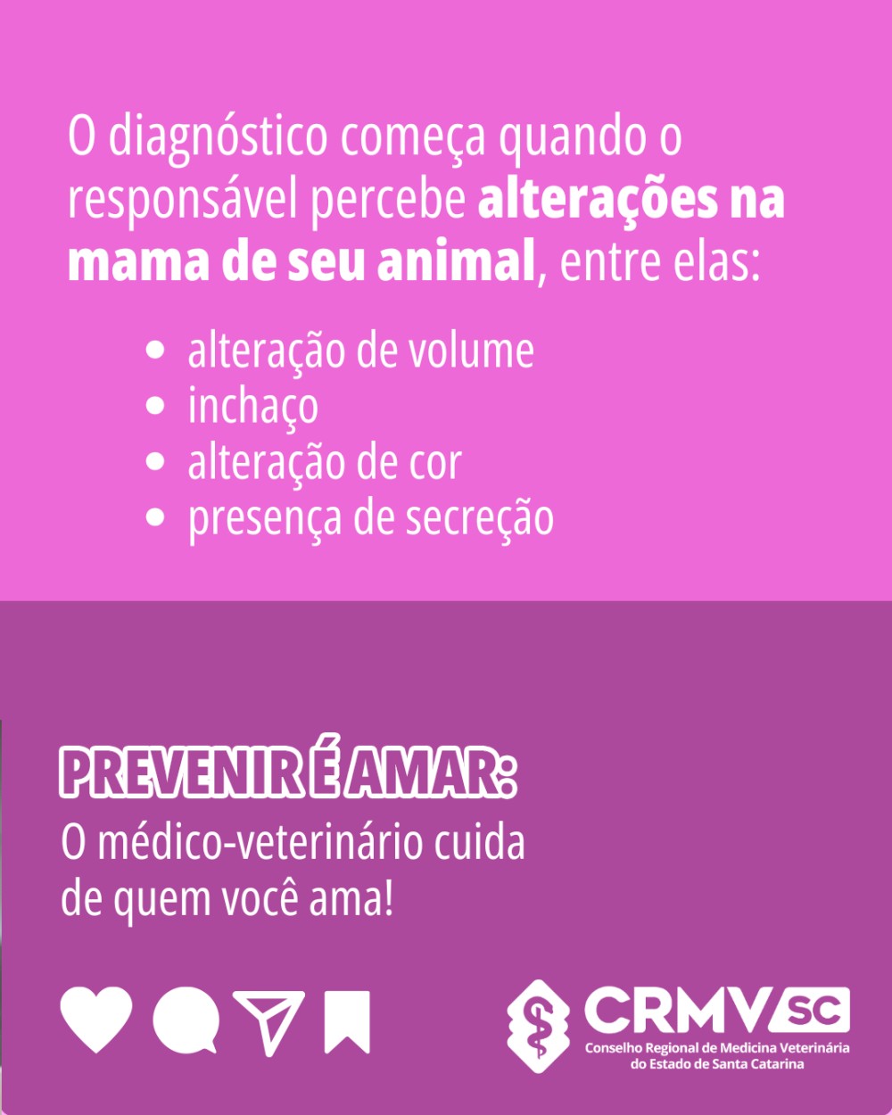 O diagnóstico precoce é essencial e alterações como caroços palpáveis, secreções, mudança de cor ou textura, ou inchaço nas mamas ( detecção que pode partir dos responsáveis) devem levar à avaliação veterinária rápida. O exame clínico, seguido de biópsia ou citologia, e complementos com exames de imagem, são decisivos para identificar se o tumor é benigno ou maligno, determinar estágio e traçar tratamento.